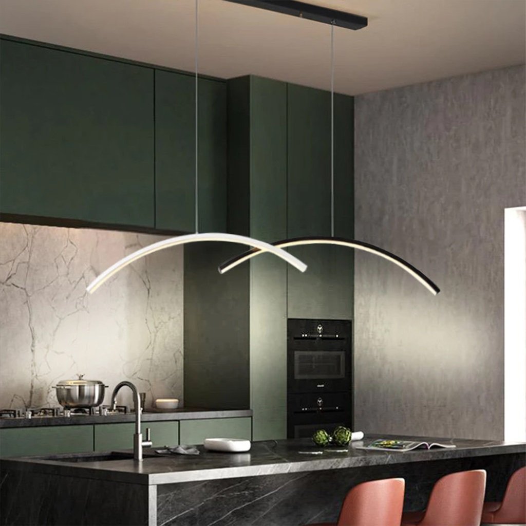 Vì form đèn đã mang tính điêu khắc, phần nội thất xung quanh nên gọn – ít chi tiết – vật liệu tinh. Các phối cảnh rất hợp gồm: tủ bếp phẳng hiện đại, mặt đá sáng, gỗ ấm, tông xám/đen/trắng, trần cao vừa phải để dải cong nổi bật mà không bị “rối mắt”.