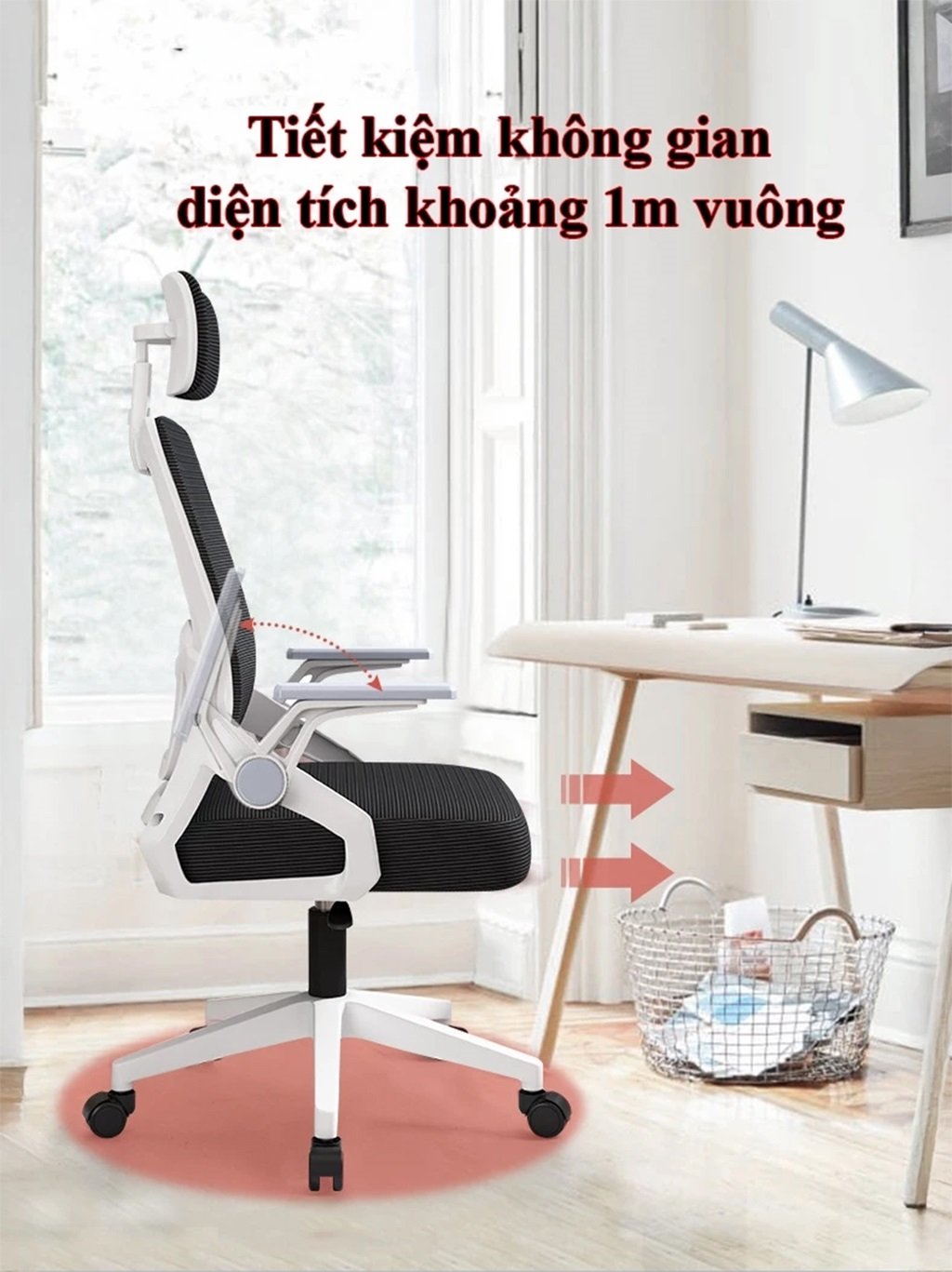 Sản phẩm được trang bị tựa đầu 2D, tay vịn gập 90 độ và khả năng nâng hạ linh hoạt, phù hợp cho làm việc, học tập và làm việc tại nhà.